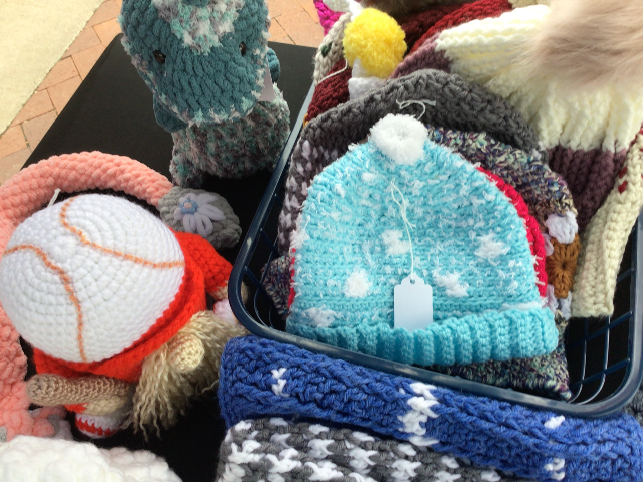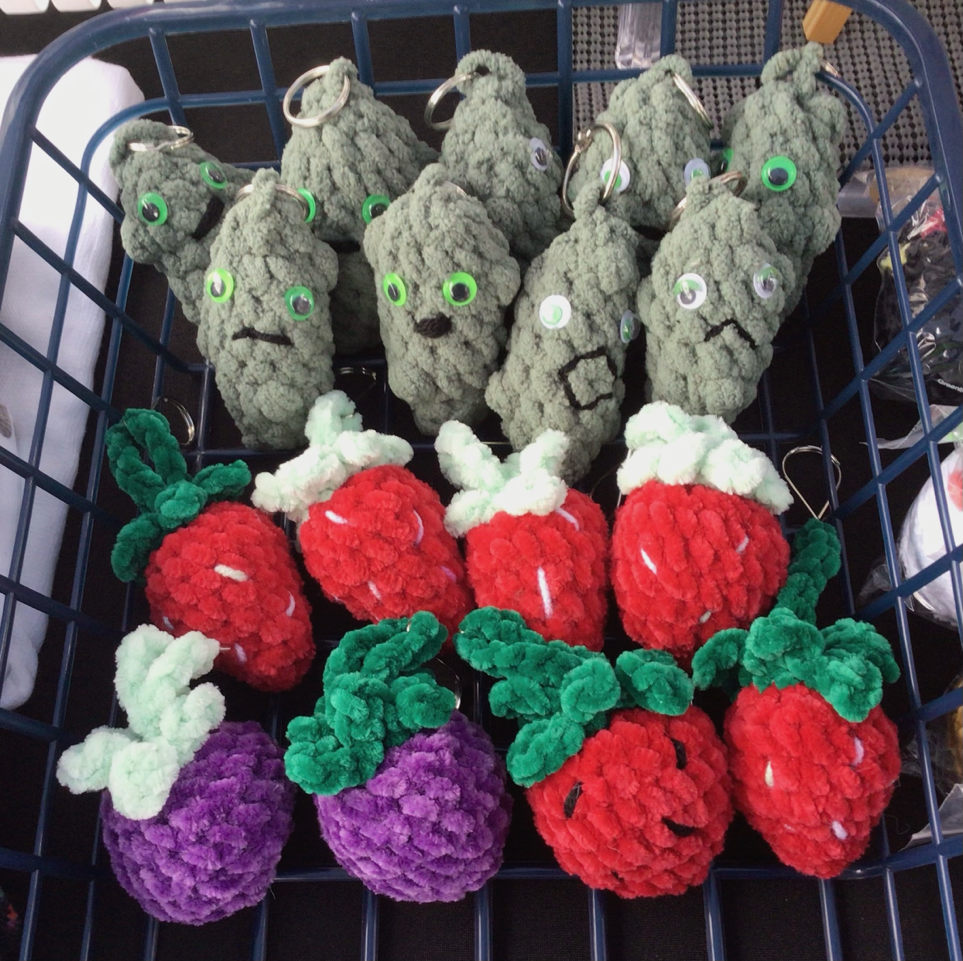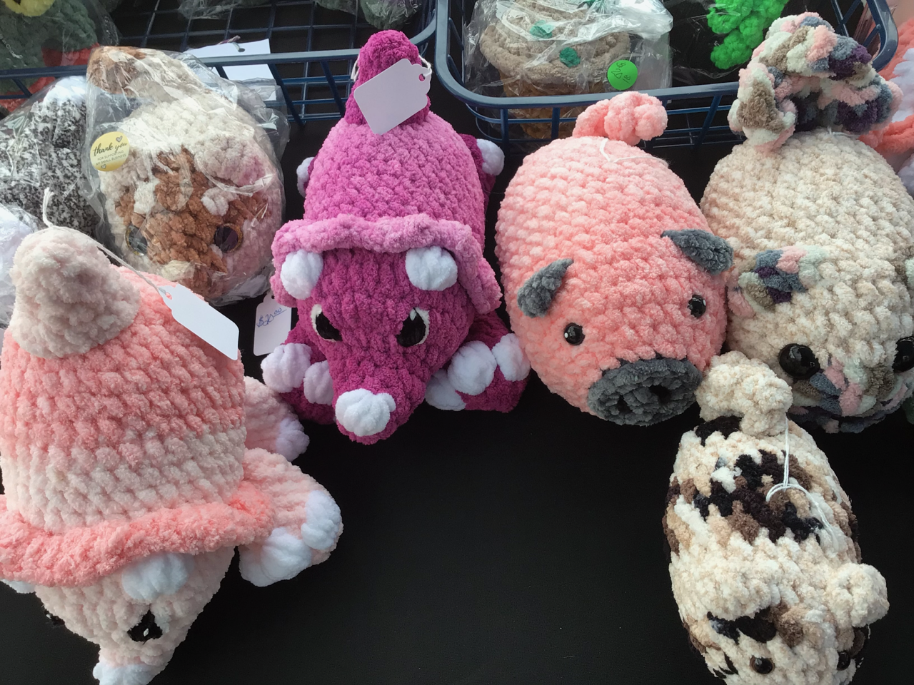 This week we’d like to introduce you to Laticia Landtiser with her booth BLUE HEART CROCHET. While not a new vendor, she has yet to have been highlighted here. Laticia makes a wide variety of crocheted items, and since she has been creating things for over 35 years, you know you will find quality work at her booth! There are blankets, cardigan sweaters, adorable children’s hats, animals, and lots of plushie dolls and characters, plants and mushrooms. There are also key chains, and Laticia adds seasonal items, like pumpkins for the Halloween/Thanksgiving holidays. Please stop by an admire her varied and colorful wares.